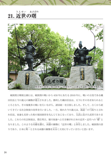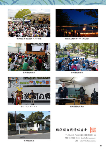 この歴史読本の作成に携わった「桶狭間古戦場保存会」は、桶狭間の戦いに関する史跡や言 い伝えなどを保存・維持整備し、地元情報を全世界に発信することなどによって、誇りうる歴 史を活かしたふるさとづくりを進めています。平成 20 年 3 月の設立以来、古戦場公園のジオ ラマ化改修、 日本で初めて建立された信長 ・ 義元 2 体の銅像、 桶狭間の戦い 450 年記念イベント、 古戦場まつりの定着と充実、おけわんこの誕生と関連グッズ開発、史跡標示や案内看板などの 整備・清掃、桶狭間小学校総合学習協力やガイドスタッフによる史跡の案内・解説など数多く の事業を続けています。これらの事業は、約 400 名の会員と多くの協力者によって支えられて います。読者の皆様におかれましては、これからの長い人生を過ごすなかで、いつ・どこにい ても桶狭間で生まれてよかった、桶狭間で生活して良かったと思えるようなふるさとづくりに、 加わっていただくことが期待されております。桶狭間古戦場保存会は、皆様の入会をいつでも 暖かく待っています。