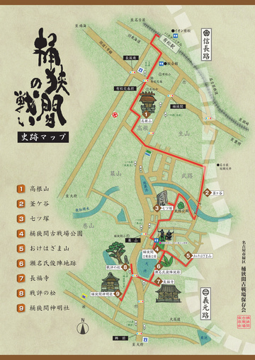 桶狭間史跡マップ 1. 高根山・幕山・巻山 2. 釜ケ谷 3. 七ツ塚 4. 桶狭間古戦場公園 5. おけはざま山 6. 瀬名氏俊陣地跡 7. 長福寺 8. 戦評の松 9. 桶狭間神明社 ゆかりの史跡 (清須城・熱田神宮) 隣接する史跡 (鳴海・大高・豊明)
